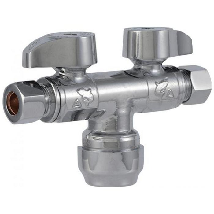 SharkBite™ Dual Shut-Off Valve, 1/2 x 3/8 x 3/8 in Nominal, Compression Connection, 125 psi, Full Port, 4 gpm Flow Rate, EPDM/PTFE Softgoods, Brass Body, Zinc Handle, Quarter-Turn Handle Actuator, Finish: Chrome, 33 to 160 deg F, 3.45 in L, Additional Information: Lead-Free